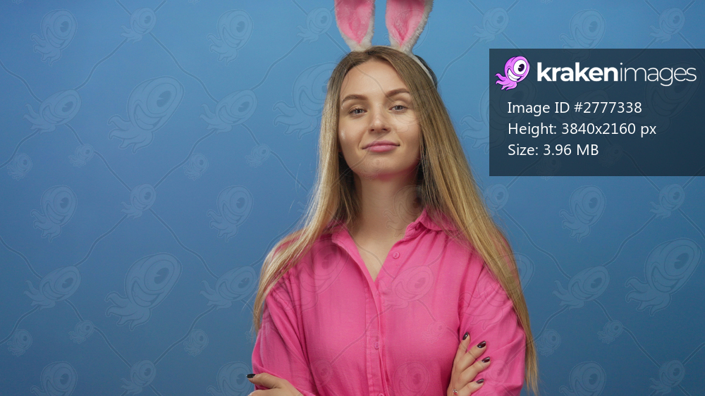 Young woman with long hair in pink shirt and rabbit ears poses confidently against isolated blue background conveying a playful and festive mood