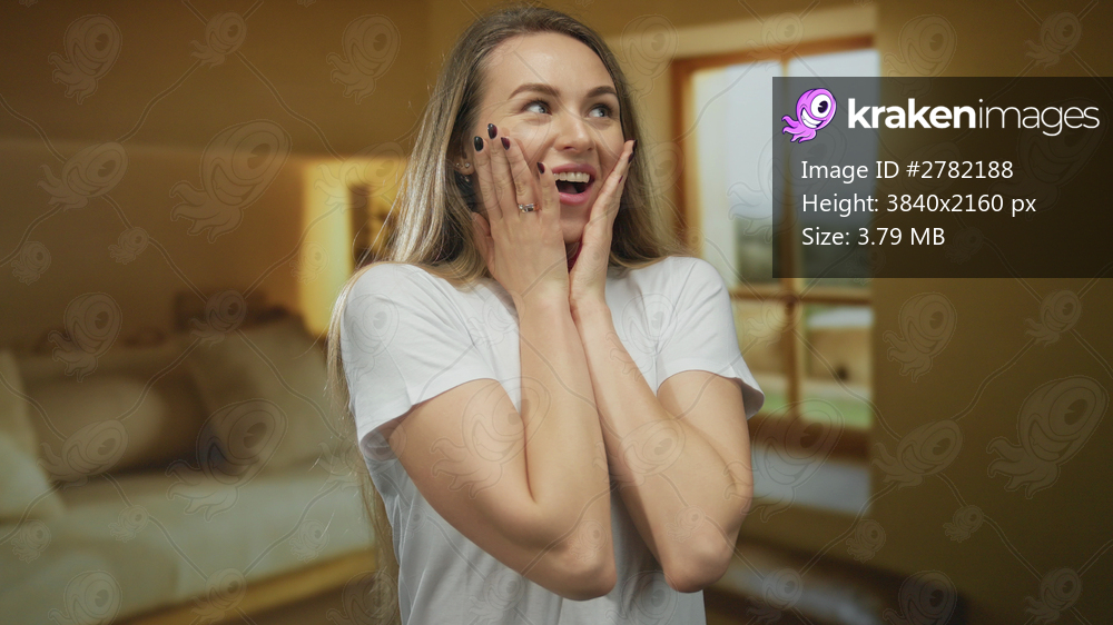 Young woman with long hair in white shirt feeling surprised and delighted in a cozy indoor room with sunlight streaming through a window.