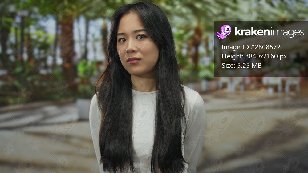Young woman with long hair in white shirt standing outdoors on a street with palm trees and tables, capturing a serene urban moment.