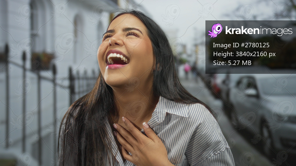 Young woman with long hair laughing joyfully on a street with cars and houses, showcasing happiness and vibrant energy in an urban outdoor setting.