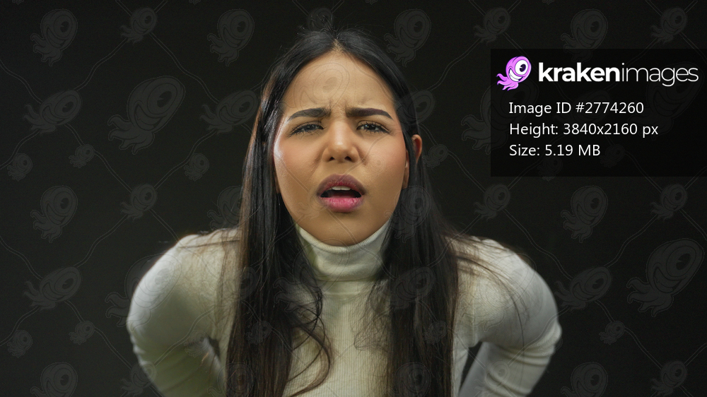 Young woman with long hair leans over with a curious expression on an isolated black background, portraying intrigue and exploration.