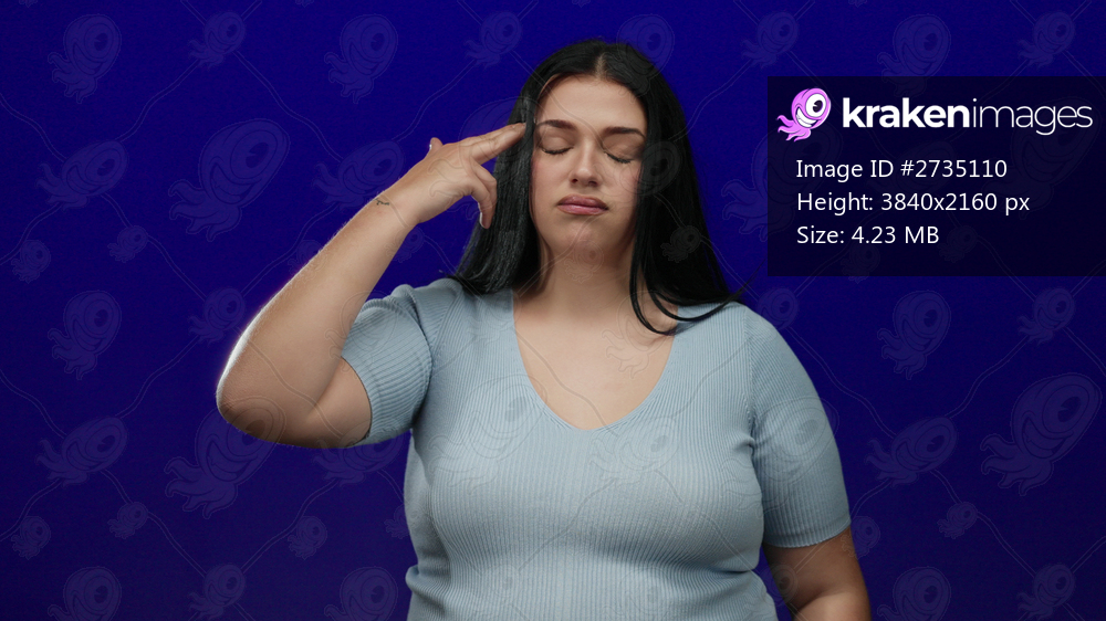 Young woman with long hair makes a gesture with fingers on her head against a blue background expressing frustration or stress while wearing a light blue shirt. - Kraken Images