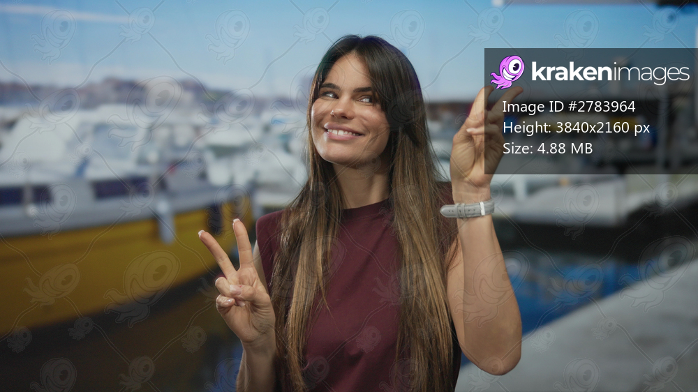 Young woman with long hair making peace signs at a marina with boats and a vibrant sea backdrop, showcasing a playful and relaxed outdoor summer scene. - Kraken Images