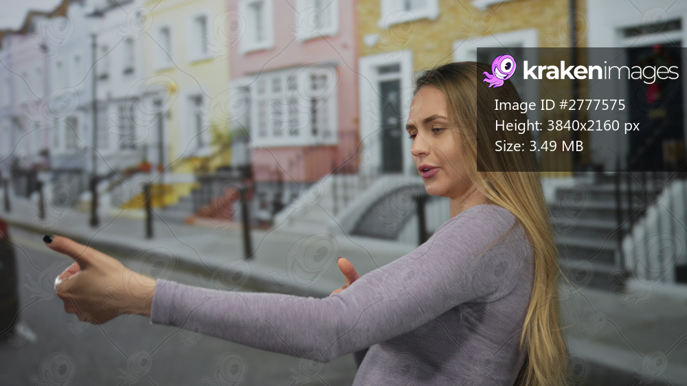 Young woman with long hair playfully mimics pulling rope gesture on a colorful city street portraying fun outdoor activity