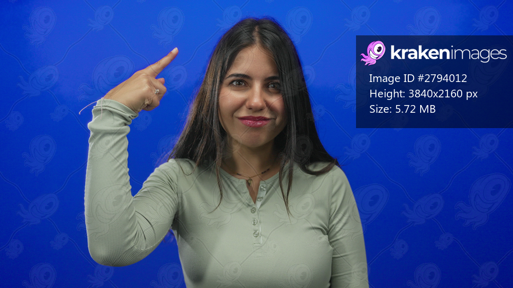Young woman with long hair points finger to temple in studio with blue wall while smiling in green long sleeve top; humor.