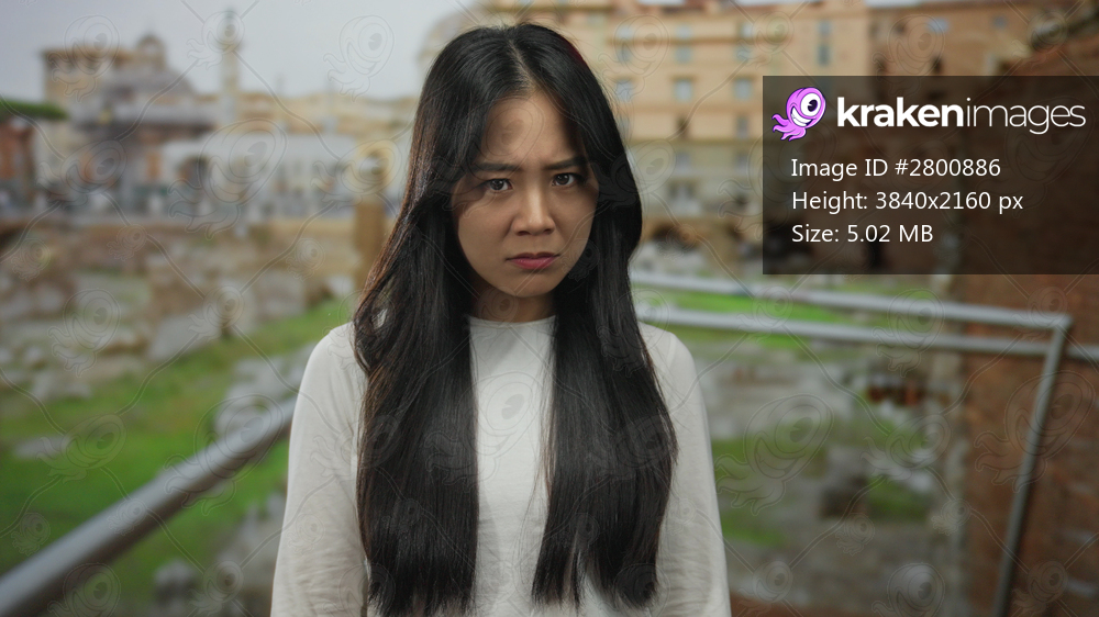 Young woman with long hair smiling at roman ruins outdoors in rome, exuding cheerful energy against a historical backdrop.