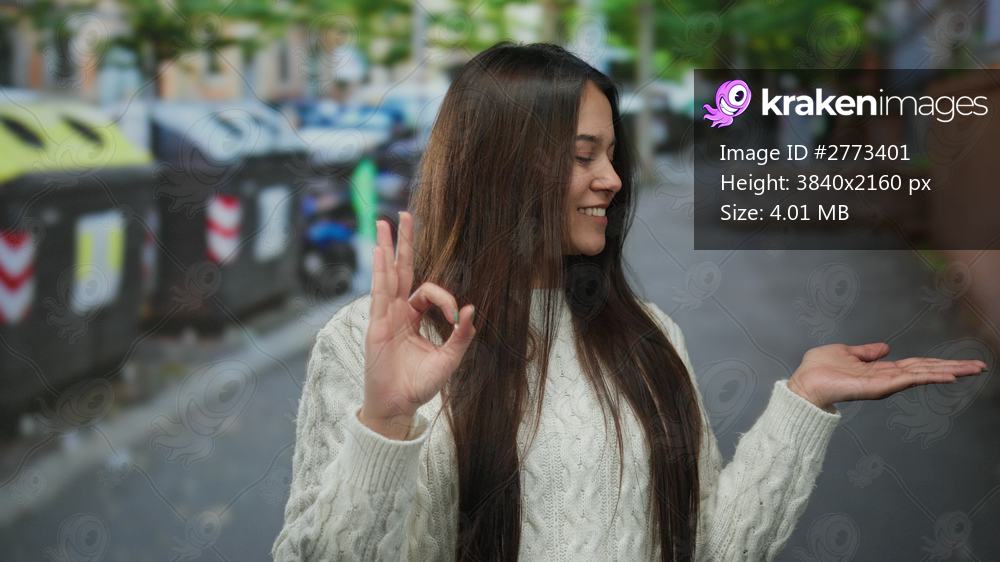 Young woman with long hair, smiling outdoors on a city street, wearing a white sweater, makes an okay gesture with her hand.