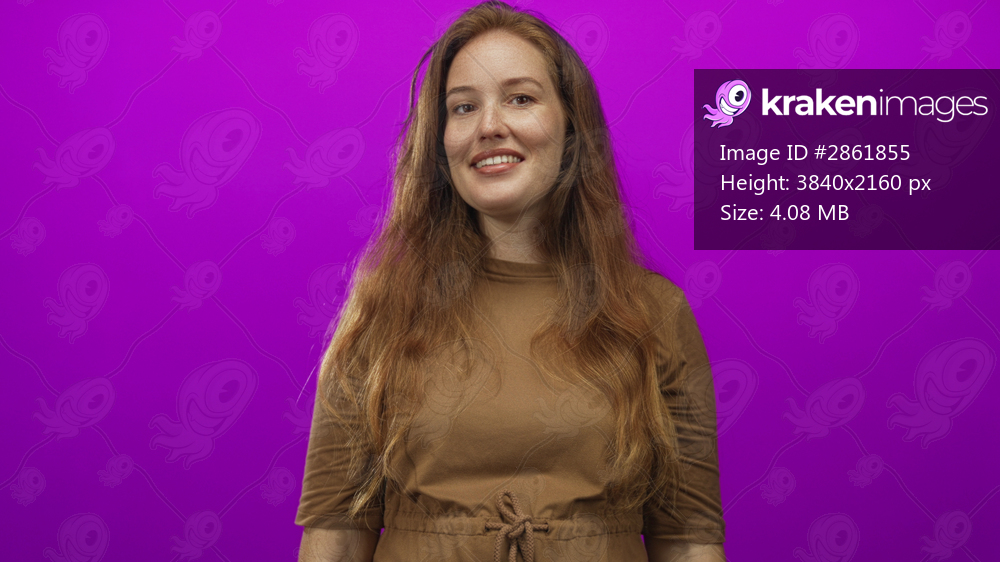 Young woman with long hair smiling and pointing finger to camera in bright purple studio; confidence.
