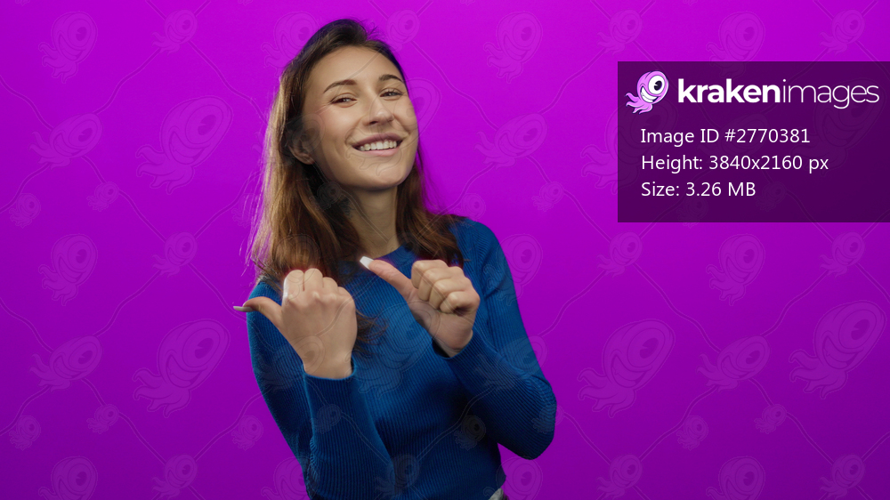 Young woman with long hair wearing a blue sweater pointing thumbs behind her while smiling and winking on an isolated vibrant pink background.