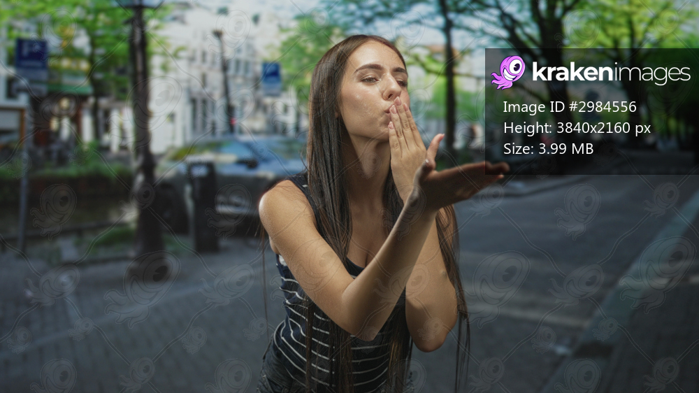 Young woman with long hair wearing striped top blows kiss, hand extended toward camera on city street; playful affection.