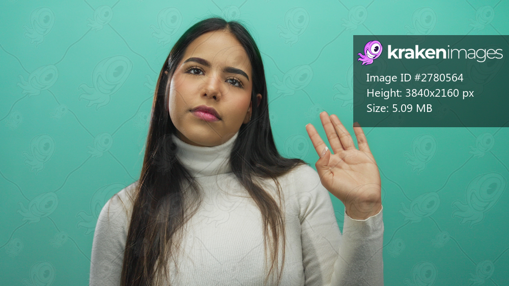 Young woman with long hair wearing turtleneck waves against green background, emanating friendly and approachable vibe, ideal for communication concepts. - Kraken Images