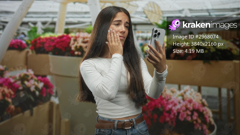 Young woman with long hair wearing white shirt and jeans holding smartphone with hand on cheek, looking worried inside a flower filled greenhouse building with rows of planters; concern. - Kraken Images