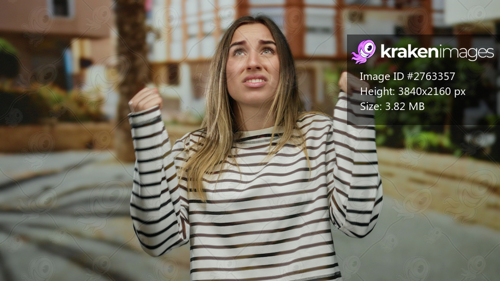 Young woman looking displeased on a city street with urban buildings and palm trees visible in the background.