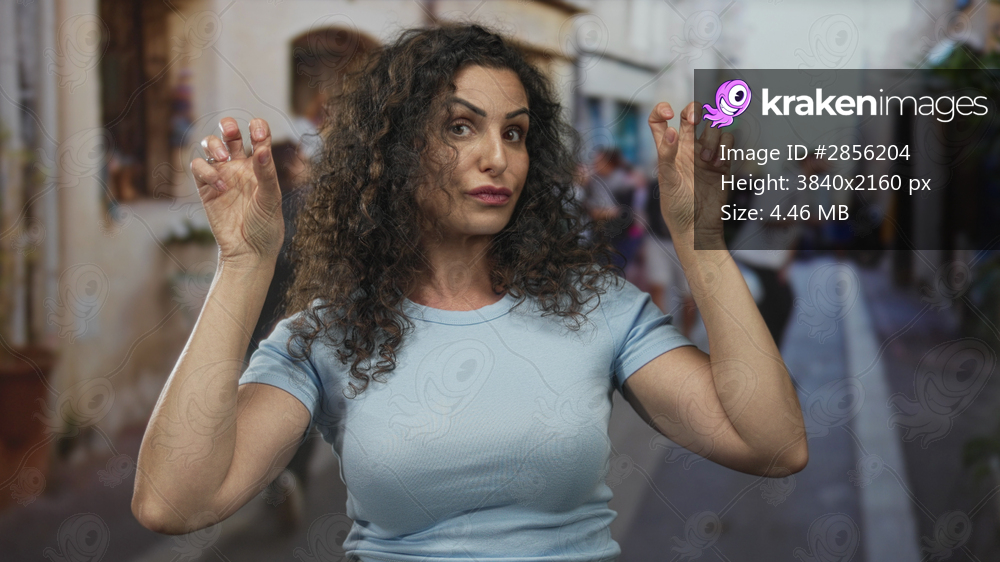 Young woman makes air quotes gesture with both hands on sunlit street lined with shops and stone facades; sarcasm playful humor.
