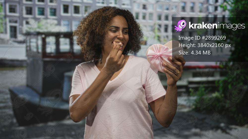 Young woman makes finger heart and holds a heart gift box on a street in amsterdam; happiness love celebration.