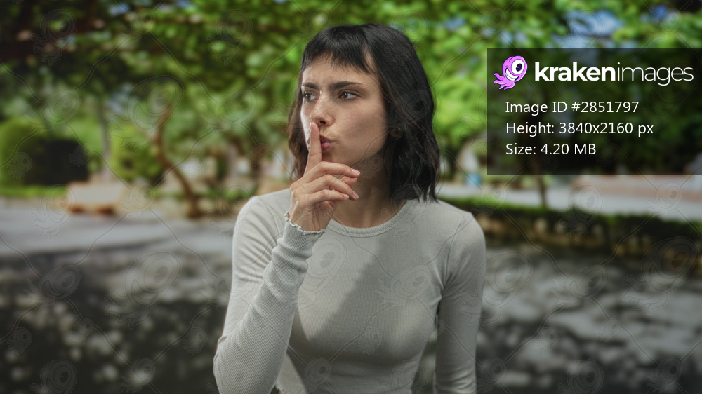 Young woman makes finger to lips gesture on street during midday sunshine for careful movement; silence.