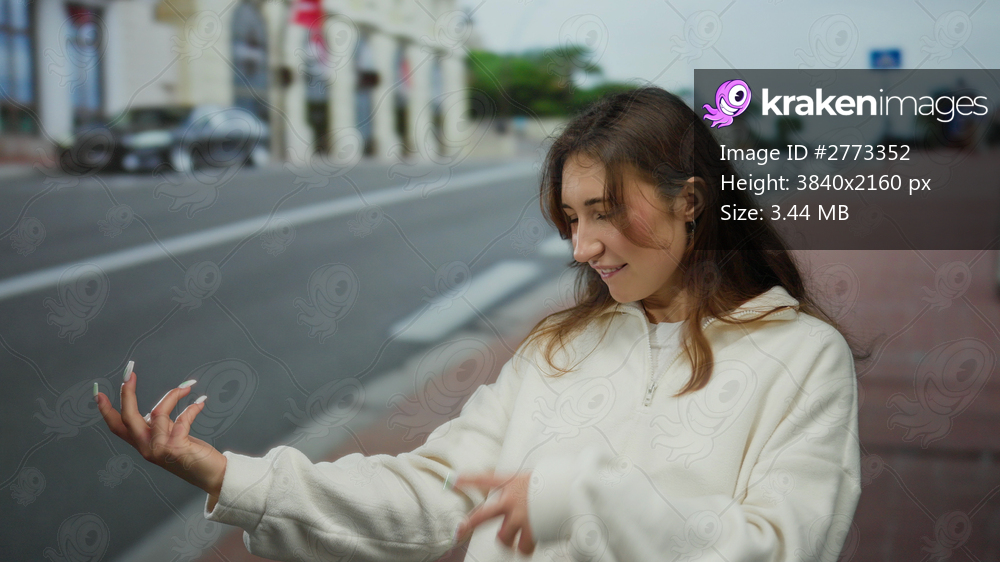 Young woman makes guitar gesture on city street in casual white sweater under overcast sky, expressing joy and creativity in urban outdoor setting.