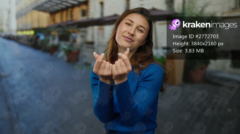 Young woman makes heart gesture with fingers while smiling on a city street, expressing happiness and connection in an urban outdoor setting.