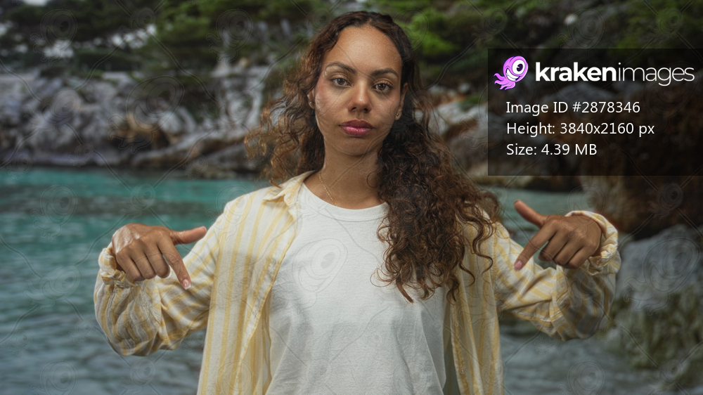 Young woman makes thumbs down gesture with both hands at rocky seaside cove forest near turquoise water and jagged rocks; calm reflection.