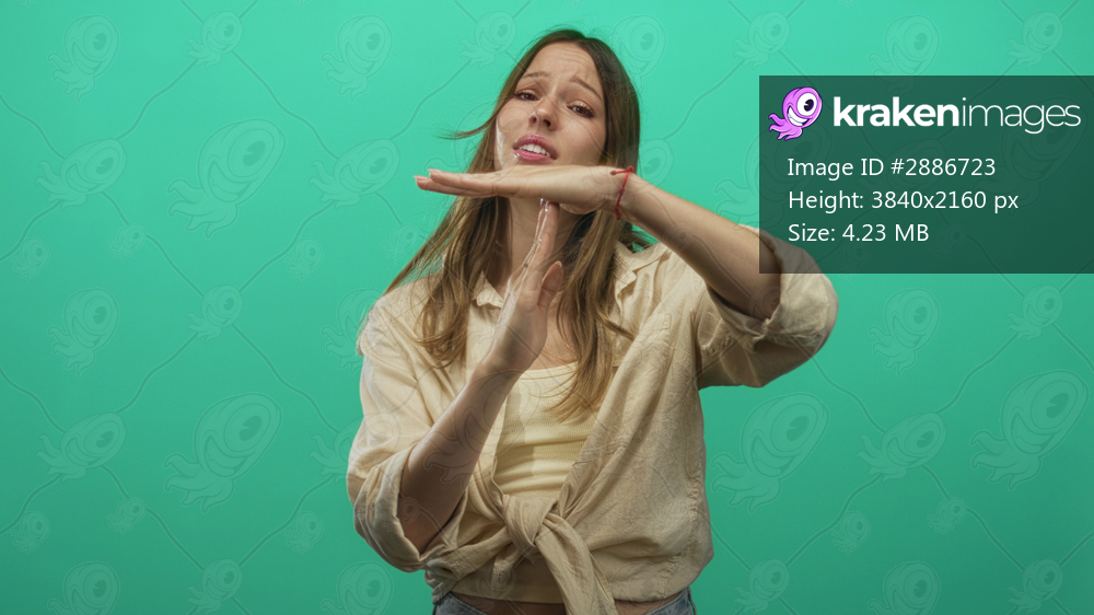 Young woman makes time out gesture with both hands near mouth and a pained expression in studio with teal green backdrop; disgust.