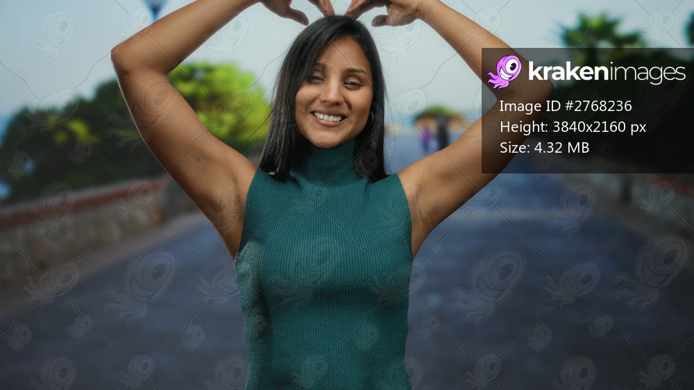 Young woman making a heart gesture with her hands outdoors on a sunny street, smiling and radiating happiness and positivity in a vibrant urban setting. - Kraken Images