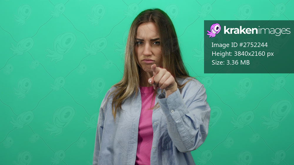 Young woman making a watching gesture with her fingers against a green isolated wall, expressing vigilance and focus, wearing casual attire and showcasing a blonde hairstyle - Kraken Images