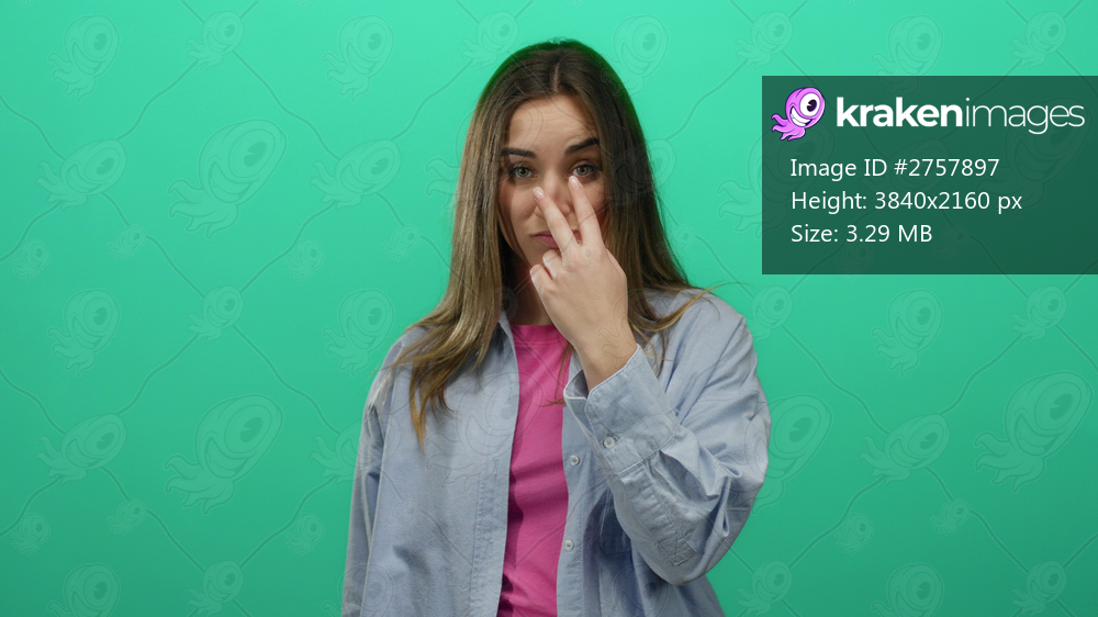Young woman making a watching gesture with her fingers against a green isolated wall, expressing vigilance and focus, wearing casual attire and showcasing a blonde hairstyle - Kraken Images