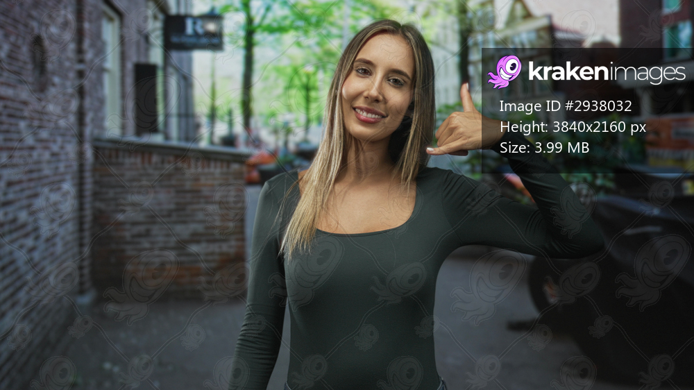 Young woman making call gesture on a city street by a brick building and parked scooter, smiling toward camera; friendly invitation.