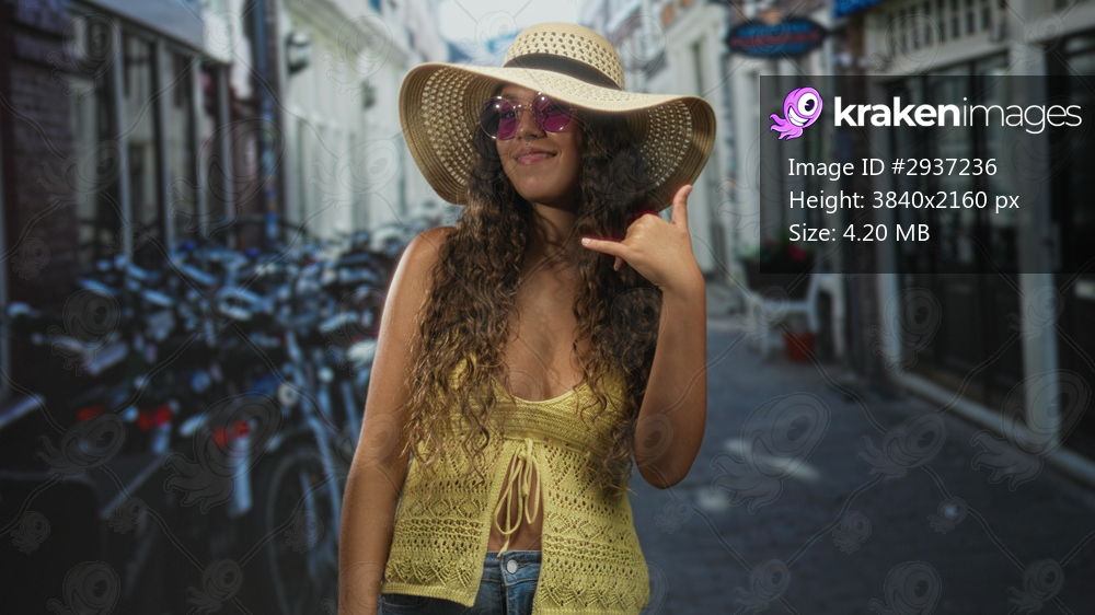 Young woman making call me hand gesture with straw hat and purple sunglasses and yellow crochet top on a narrow urban street lined with parked bicycles; vacation carefree travel. - Kraken Images