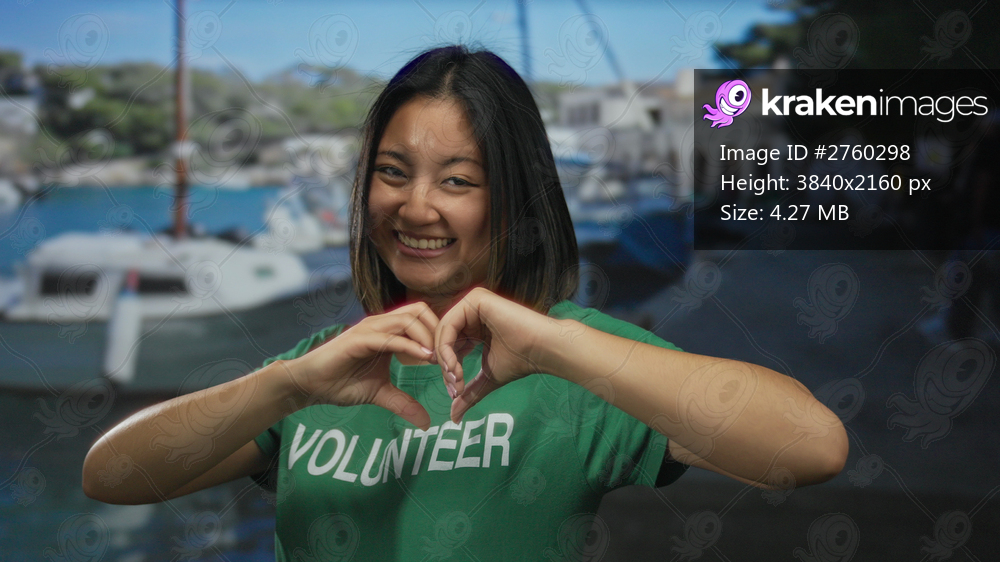 Young woman making heart gesture at port with boats in the background, smiling while wearing a green volunteer t-shirt, capturing a warm outdoor seaside scene. - Kraken Images