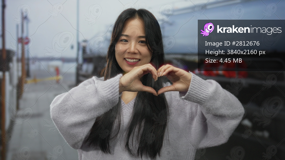 Young woman making heart gesture outdoors near industrial area with train in background, smiling and displaying happiness and love.