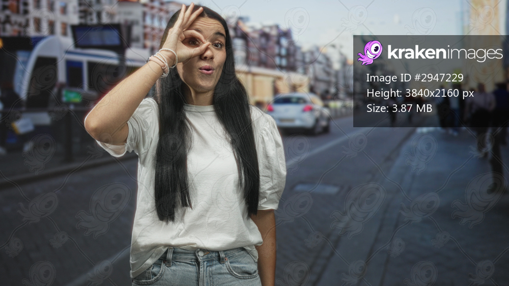 Young woman making ok sign with hand over eye on a busy street near tram wearing white tshirt and jeans; playful curiosity.