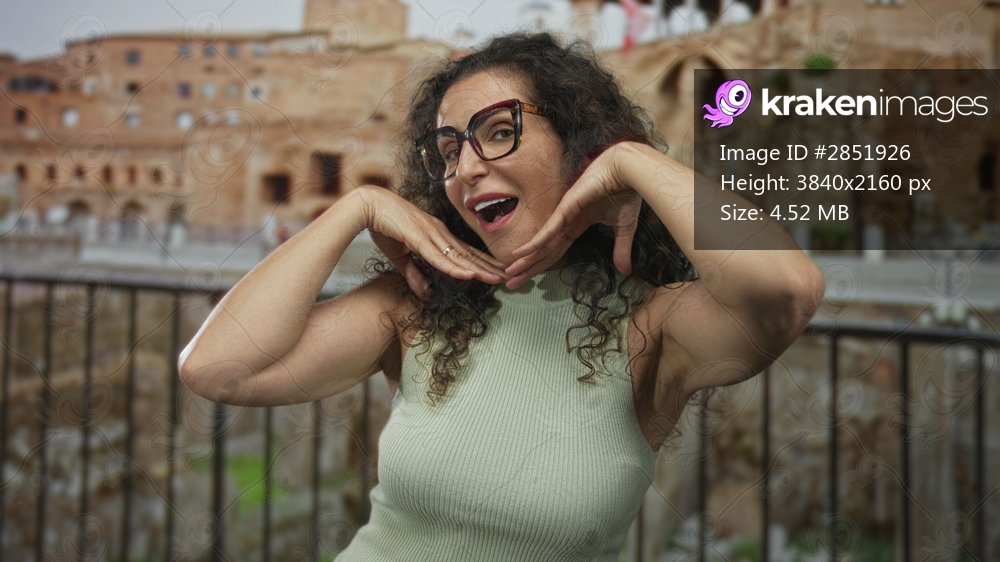 Young woman making peace sign with hand in front of crumbling ancient roman ruins and towering stone building; joy.
