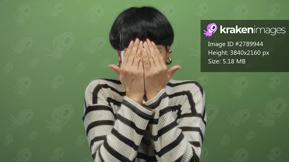 Young woman making playful gestures in front of a green background, wearing a striped sweater, expressing joy and creativity with her hands framing her face. - Kraken Images