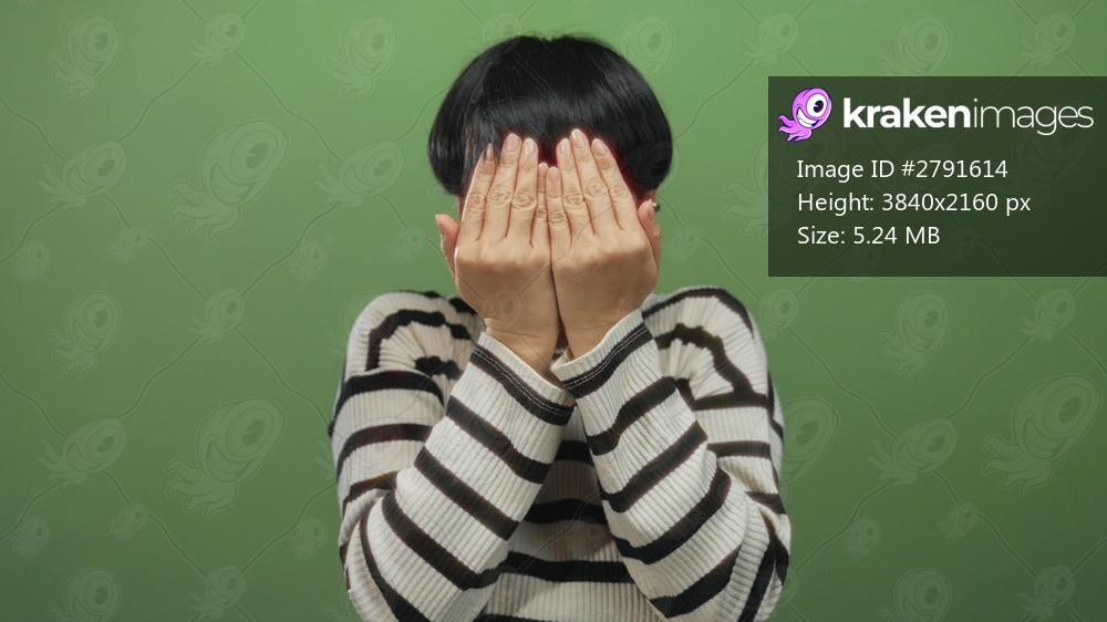 Young woman making playful gestures in front of a green background, wearing a striped sweater, expressing joy and creativity with her hands framing her face. - Kraken Images