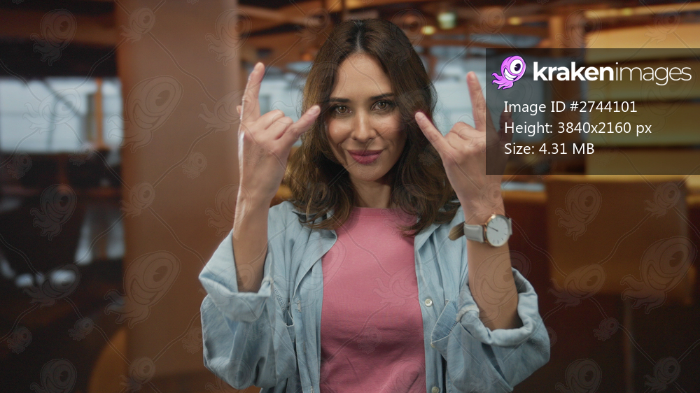 Young woman making rock gesture indoors at a hotel setting, smiling confidently in casual attire with background emphasizing warm, ambient lighting and modern decor. - Kraken Images