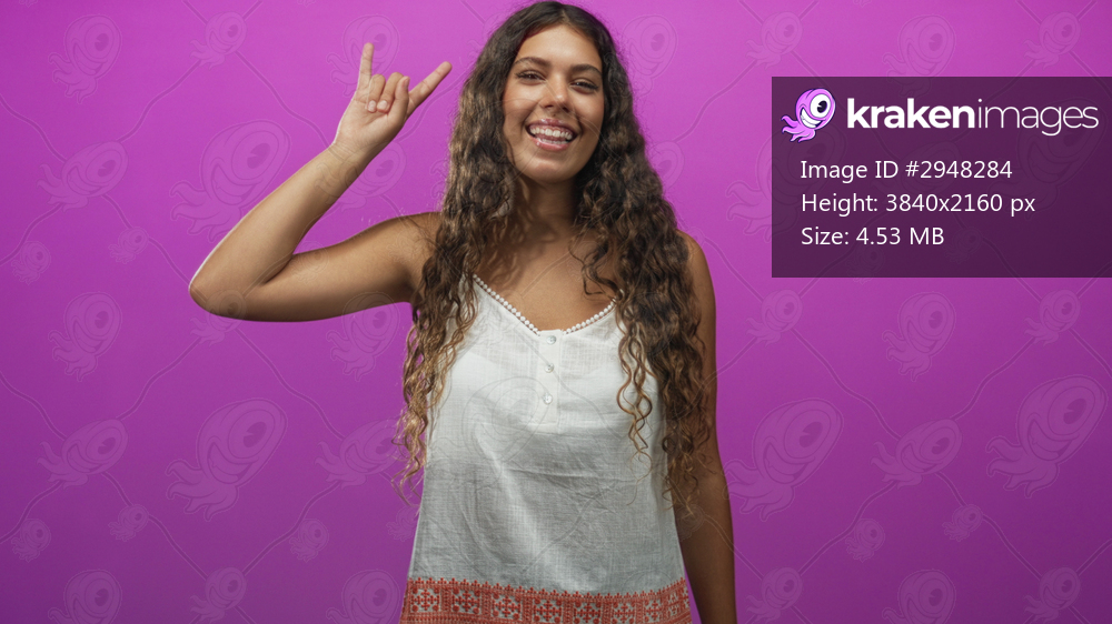 Young woman making rock horns gesture with hand in studio purple backdrop, wearing white sleeveless dress and smiling with braces; playful energy.