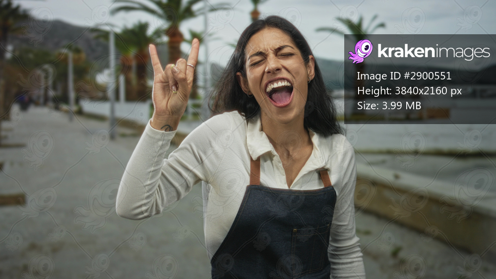 Young woman making rock horns gesture on street by waterfront promenade with palm trees, wearing denim apron and white shirt; playful joy.