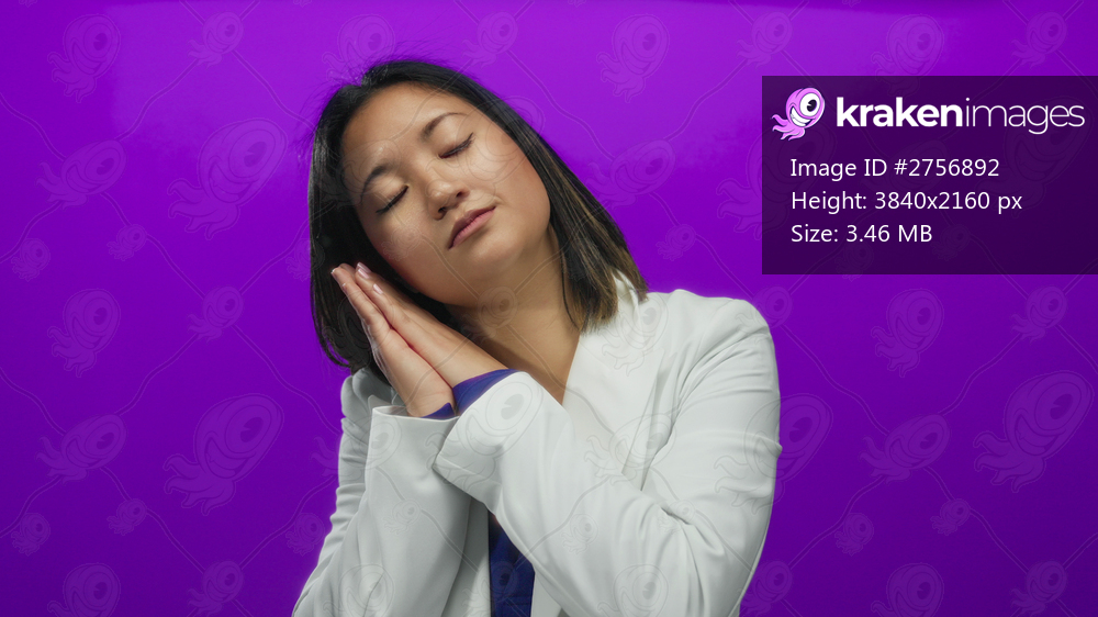 Young woman making sleep gesture with hands under chin in front of vibrant purple background wearing formal white jacket demonstrating tired or drowsy expression. - Kraken Images