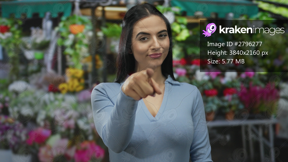 Young woman making watchful gesture in outdoor flower shop, surrounded by colorful blooms, exuding a playful and attentive vibe in a public marketplace. - Kraken Images