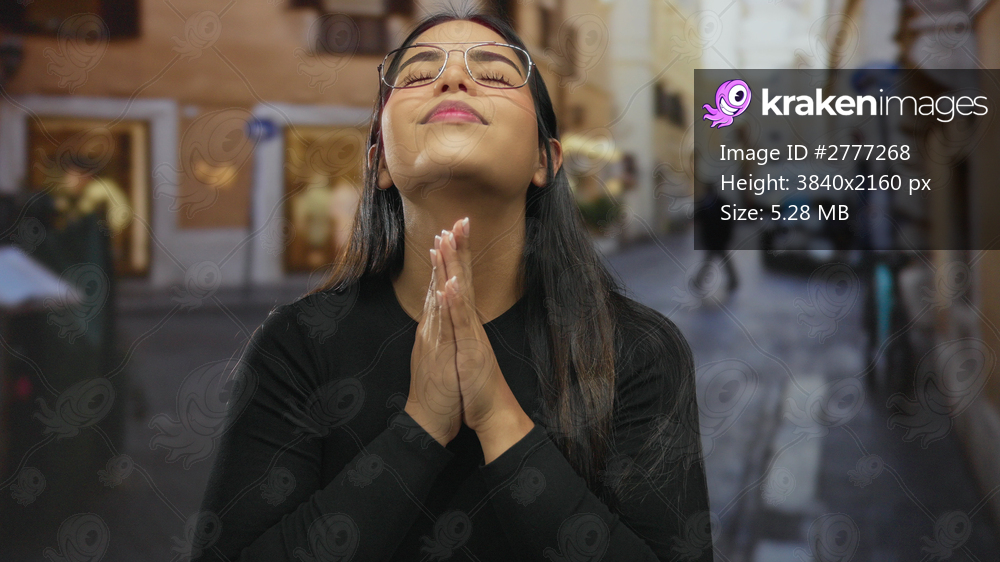 Young woman meditating on a street outdoors with a pensive expression wearing glasses and a black outfit