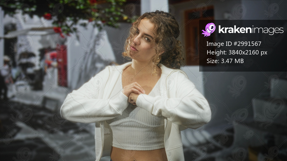 Young woman with navel piercing and hoop earrings, clasped hands at chest wearing white hoodie and crop tank on a whitewashed street with stairs and door visible; confidence strength. - Kraken Images