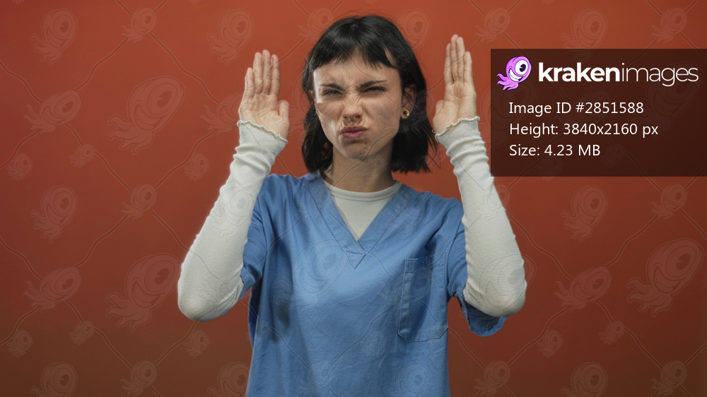 Young woman nurse covers face with open palms against a solid red studio wall while smiling; playfulness.