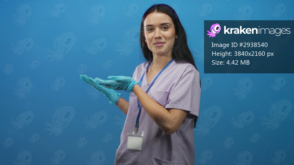 Young woman nurse in lavender scrubs with badge and blue gloves presenting cupped hands toward viewer in studio; compassion.