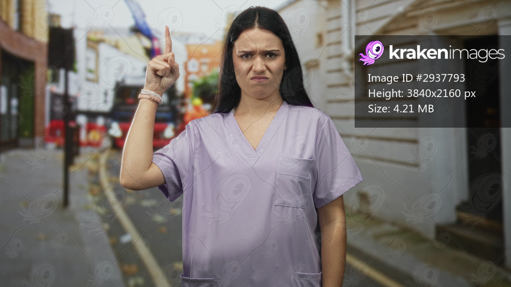 Young woman nurse in lavender scrubs points finger upward beside a white building on a narrow city street while looking up with a puzzled expression; concern caution. - Kraken Images