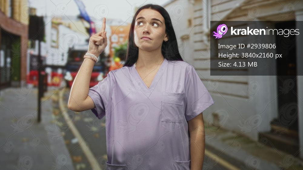 Young woman nurse in lavender scrubs points finger upward beside a white building on a narrow city street while looking up with a puzzled expression; concern caution. - Kraken Images