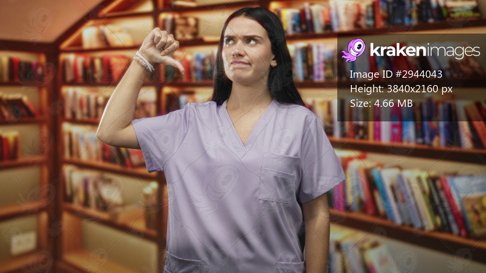 Young woman nurse in lavender scrubs points her right thumb toward chest among packed bookshelves in a library with a focused expression; determination. - Kraken Images