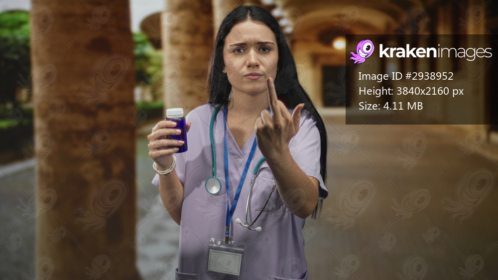 Young woman nurse in scrubs holding purple pill bottle and showing middle finger in building corridor; anger defiance.