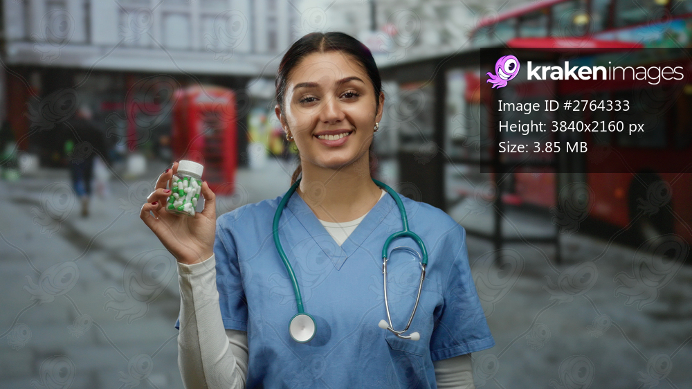 Young woman nurse in urban street holding bottle, smiling in scrubs with stethoscope in bustling city with red buses and pedestrians.