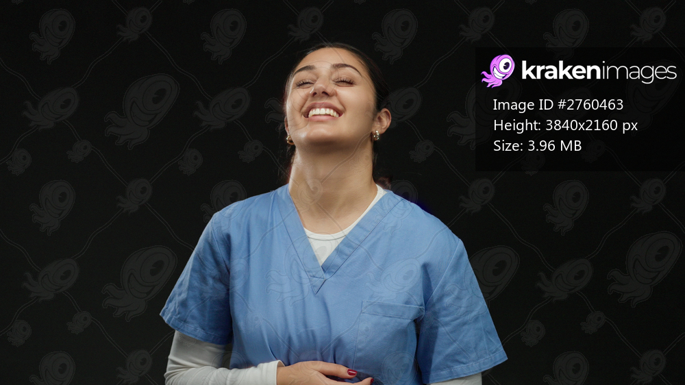 Young woman nurse laughing in blue scrubs with black isolated background exuding joy and confidence while standing alone indoors.